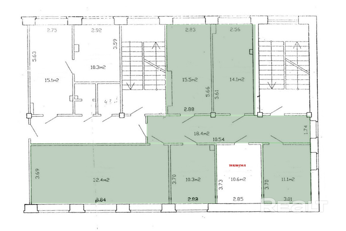 Изолированный офисный блок с отдельным входом общей площадью 101,8 м2 расположен на втором этаже.