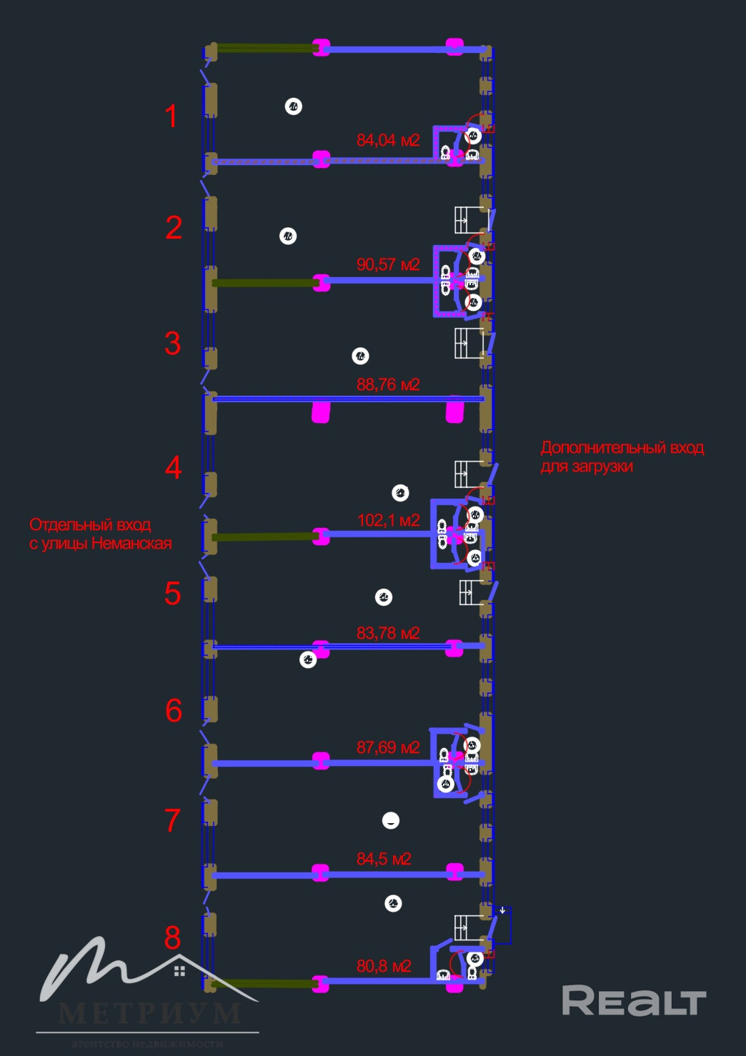 В наличие торгово-административные помещения от 80,8 м2 до 215 м2, расположенные на 1-ом этаже жилого дома, на пересечении улиц Неманская и Налибокская.