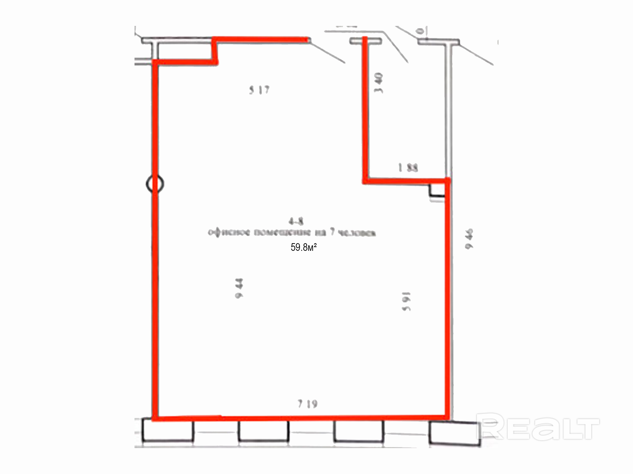 Площадь помещения 59,8 кв.м, оно расположено на 4 этаже.