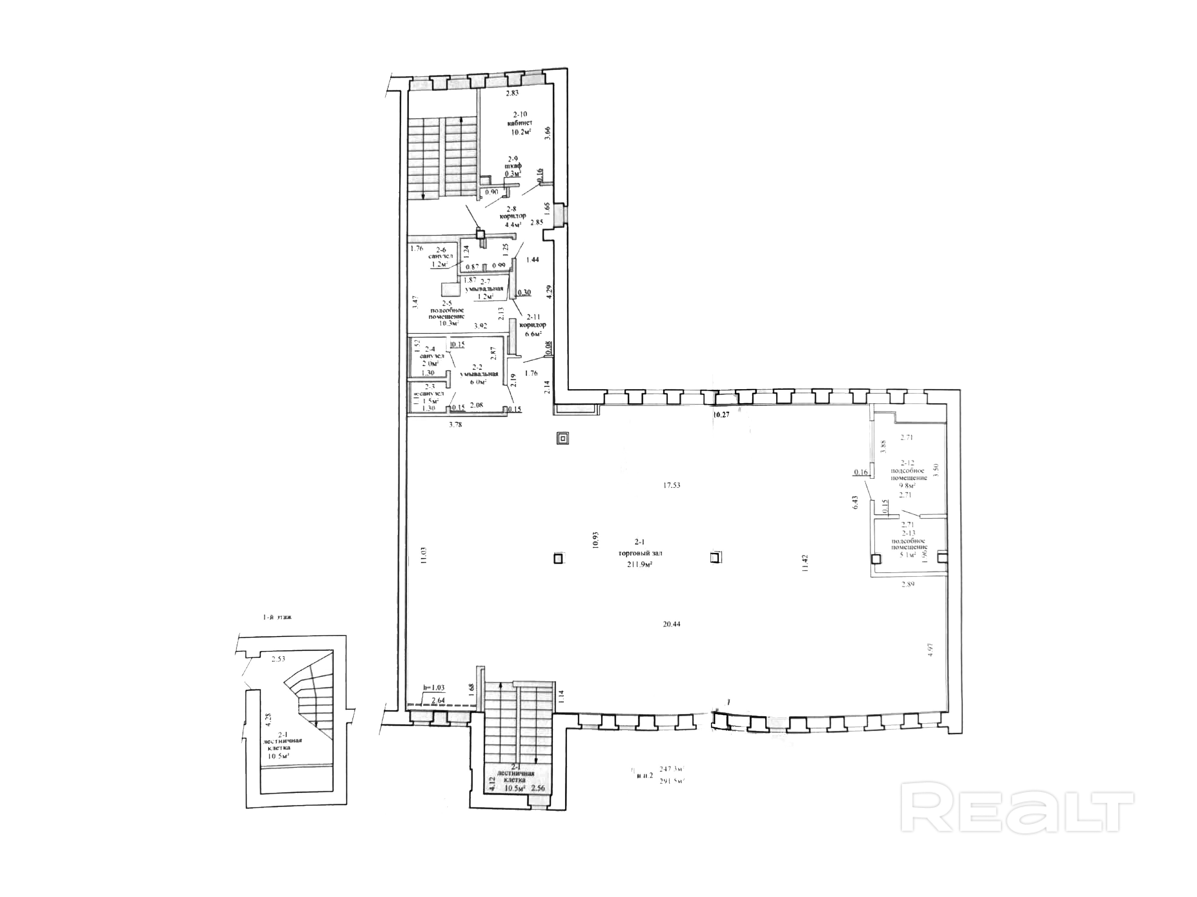 Торговое помещение площадью 310 м2 расположено на втором этаже отдельно стоящего административного здания.
