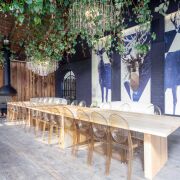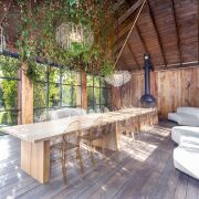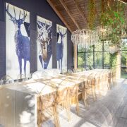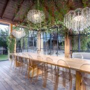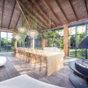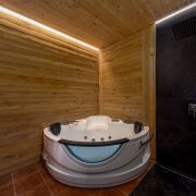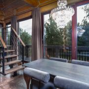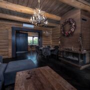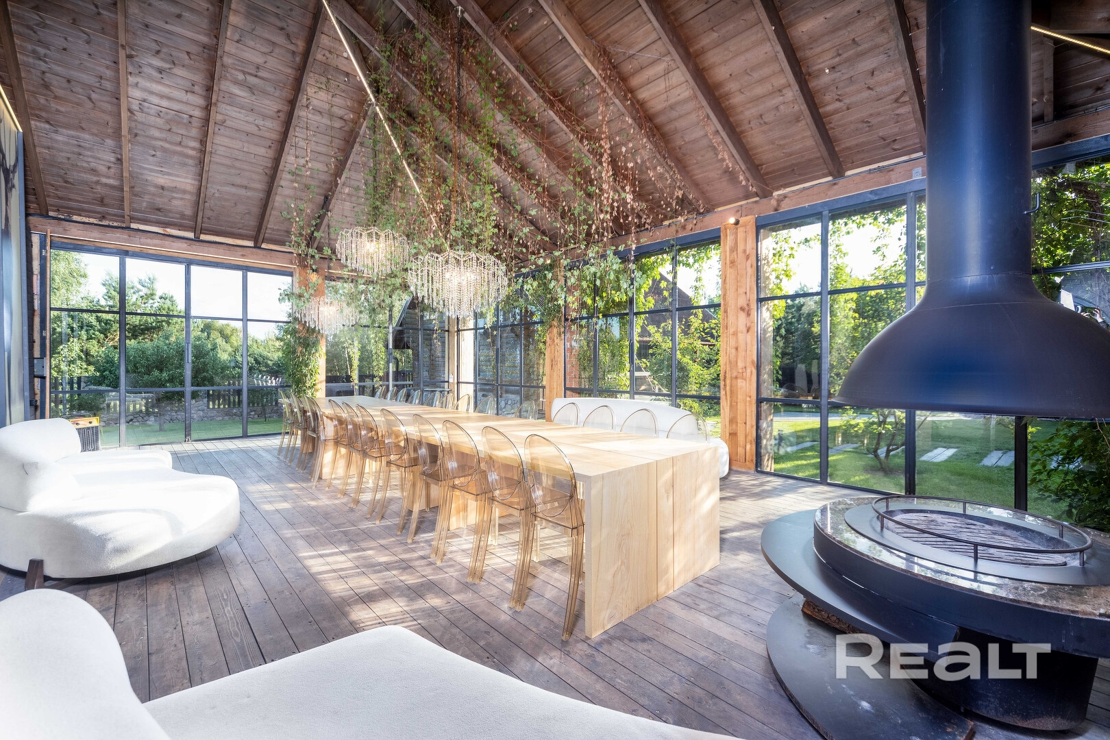 - Высокие потолки, панорамное остекление, хрустальные люстры, каминная зона.