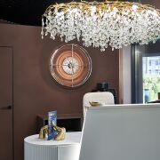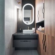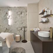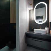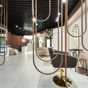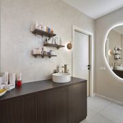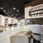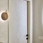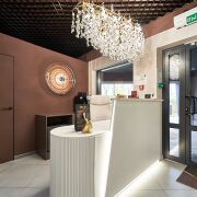 Стильный интерьер выполнен по индивидуальному дизайн проекту, с использованием качественных материалов: итальянская плитка керамогранит, декоративная штукатурка, двери невидимки, «парящий» потолок. Особое внимание было уделено элементам интерьера: дизайнерская люстра, итальянские светильники, фурнитура, зеркала, настенные часы, инвентарь, металлические шторы зонирующие пространство и т.д.