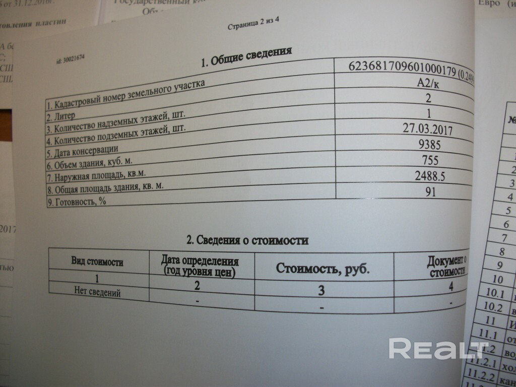 Капитального строения общей площадью 2488,5 кв. метров, с инвентарным номером 600/U-156800 - строительная готовность – 91%, количество этажей – 3, количество подземных этажей – 1, дата консервации – 27.03.2017г., общая площадь здания – 2 488,5 кв.м., отделка отсутствует, электроснабжение – временный ввод силового кабеля, отопление отсутствует (разведено).