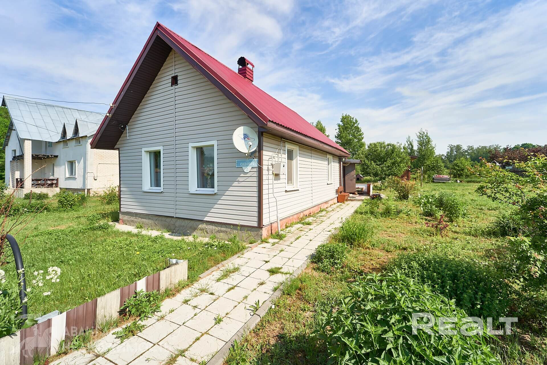 Дом расположен на огороженном земельном участке площадью 22 сотки. Помимо дома на участке есть хозяйственные постройки и баня. Здесь также произрастают садовые деревья, есть достаточно места для будущих сада и огорода.