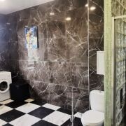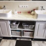 3 больших спальни: 16,4 кв.м., 14,9 кв.м., 20,7 кв.м. (с гардеробной), полы ламинат. Санузел 14,2 кв.м. с большой душевой кабиной, 2 умывальника, пол с подогревом.