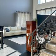 Лестница со ступеньками из мрамора, изысканные кованные перила выполнены по индивидуальному заказу.