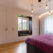 Массивная лестница из металлического каркаса, привлекает внимание своей формой и выступает как отдельный архитектурный элемент. На втором этаже две изолированные комнаты, которые можно организовать как детские. Окна выходят на сторону, где участок граничит с лесополосой. Санузел оборудован душевой кабиной. Под скатом крыши организовано просторное помещение для хранения.