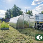 На участке установлен парник. Высажены декоративные туи и оформлены грядки для посадок.