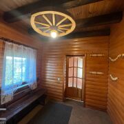 В гостиной имеется камин, барная стойка, газовая плита, мебель из дерева. В жилых комнатах на втором этаже имеется по 2 кровати. В бильярдной общей площадью около 35 кв.м расположено 2 дивана и бильярдный стол. На первом этаже санузел и топочная с газовым котлом и бойлером. Водоснабжение в доме из скважины, канализация местная, отопление газовое. Также на первом этаже находится сауна и бассейн. Пол на первом этаже - плитка, на втором - доска.