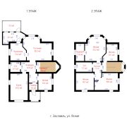 На первом этаже расположились просторная (30,2м2) гостиная с эркерным окном. Почти не уступает гостиной в размере двадцатичетырёхметровая кухня! Хол – 13 м2 Тринадцатиметровая комната кажется маленькой на общем фоне. На втором этаже – четыре умеренно просторные комнаты (23, 19, 16 и 12 квадратных метра). К большой комнате примыкает восьмиметровая гардеробная