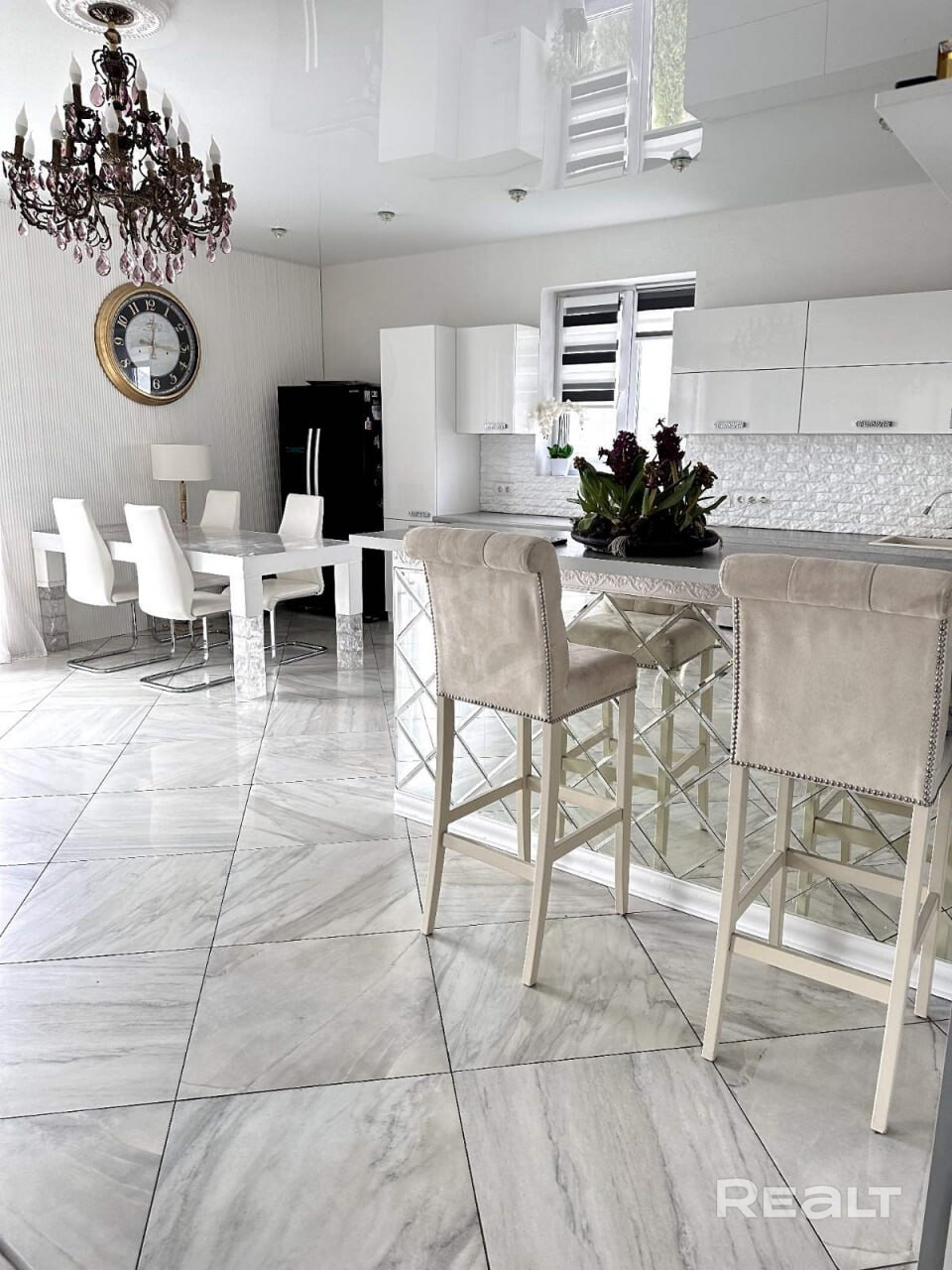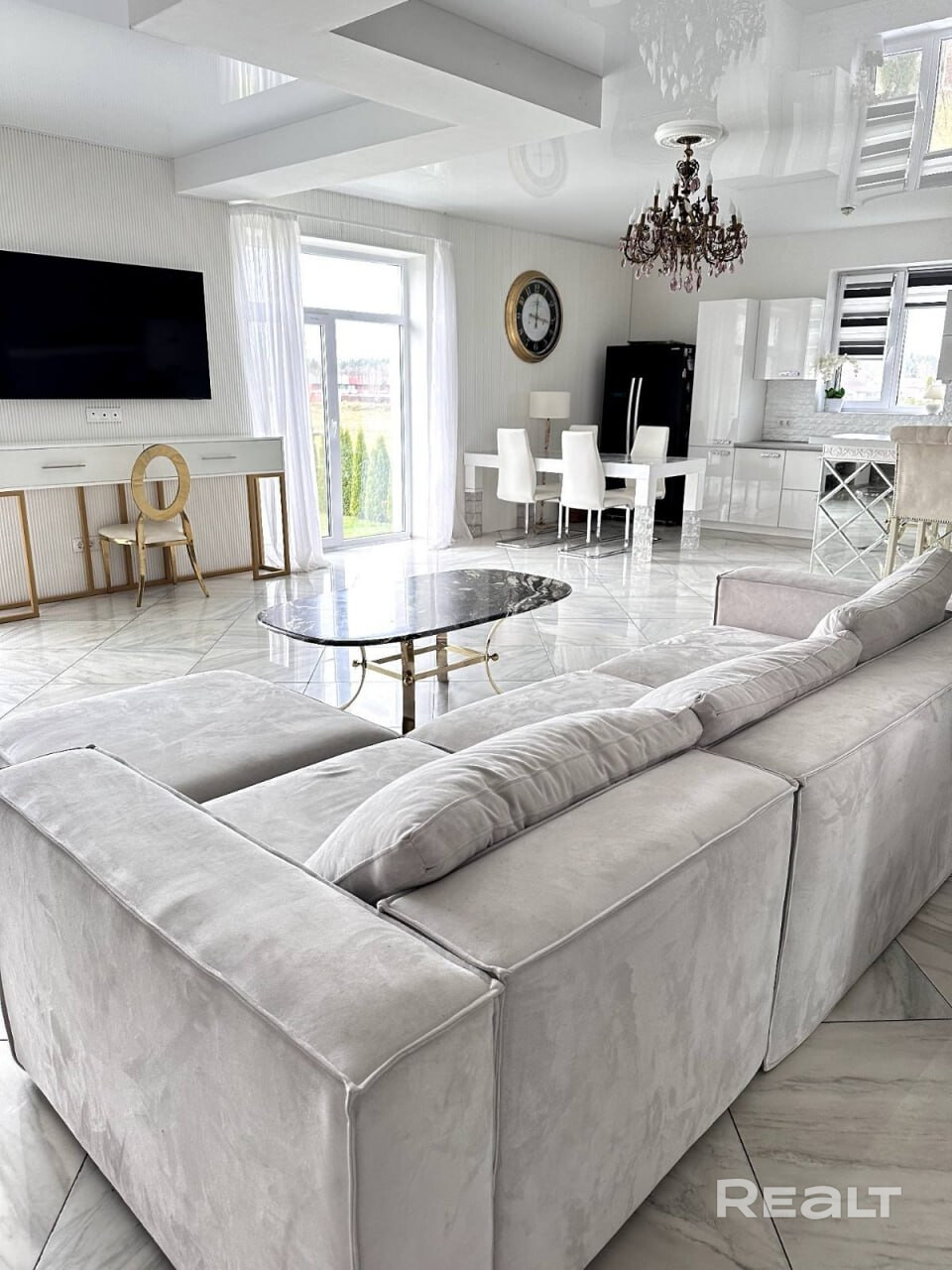 Гостиная совмещена с кухней, что позволяет еще больше увеличить пространство и встречаться за большим обеденным столом всей семьей. Также на первом этаже 2 спальные комнаты, которые могут быть переоборудованы под кабинет, гардеробная и сан/узел.