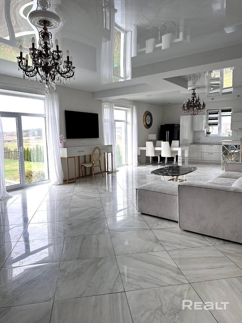 Первый этаж начинается с удобной входной группы и летней террасы, где прекрасно можно проводить время с друзьями и замечательными соседями. Зайдя в дом, мы сразу попадаем в сердце дома - огромную светлую гостиную с камином и панорамными окнами в пол из которых открываются потрясающие перспективные живописные виды!