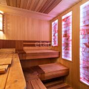 Так же в парной установлена гималайская целебная соляная стена, испарение полезных микроэлементов и ионов из минералов гималайской соли становится максимально активным и полезным для человека при повышении температуры. Установлен керамический дымоход с модулями из вулканической пемзы от немецкой фирмы «Schiedel», душевая. Уютная комната отдыха, со стеклянной панорамной топкой, смарт ТВ, холодильник, санузел.