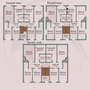 В коттедже располагается шесть полноценных трехкомнатных квартир, по две квартиры на этаже.