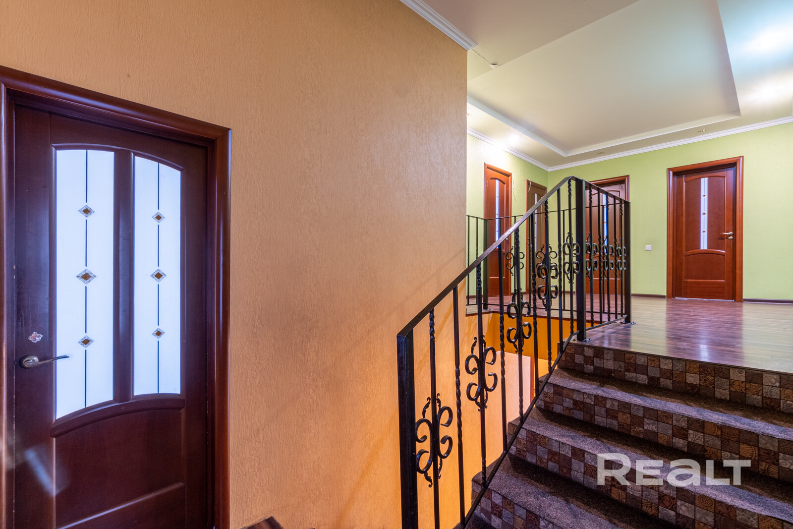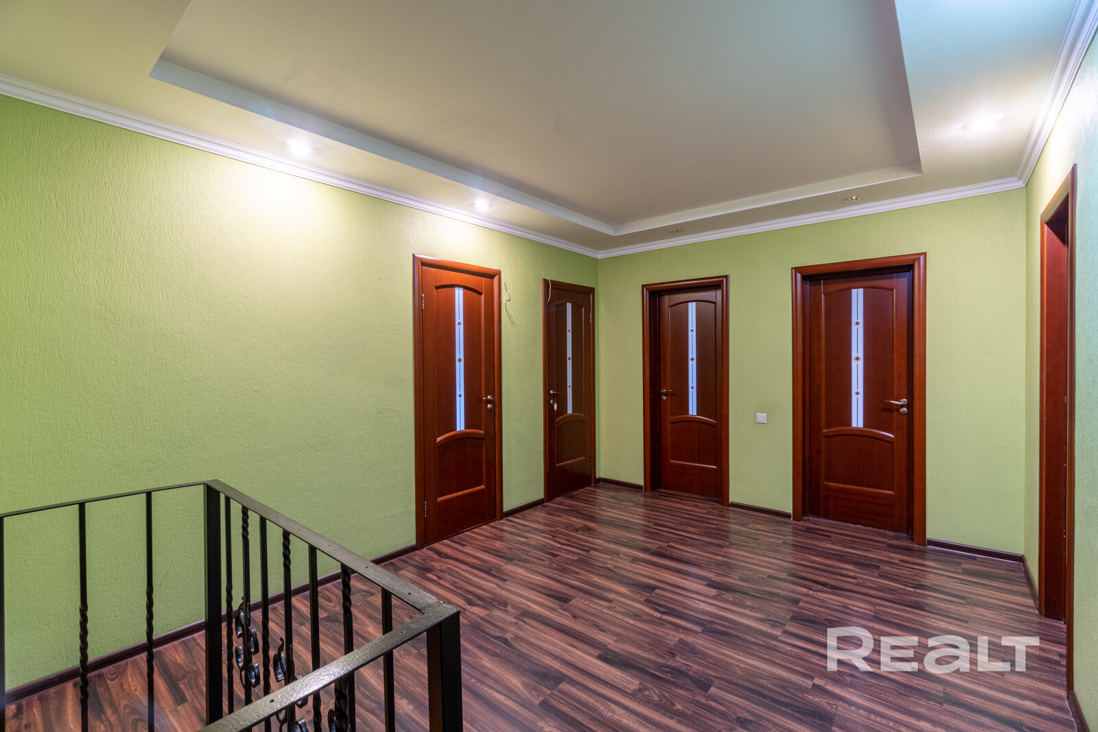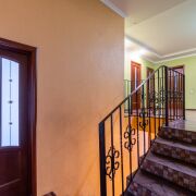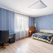 На первом этаже располагается гостиная, кухня и санузел. На втором - четыре спальни, гардеробная и санузел. Все комнаты светлые и комфортабельные. Потолки высокие. Лестница украшена авторской ковкой.