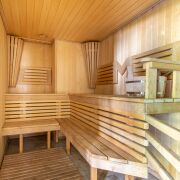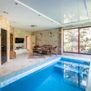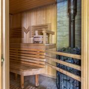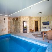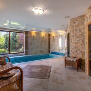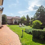 На участке расположен банный комплекс с бассейном и 2 саунами (русская баня на дровах и хамам). Красивая и уютная терраса для отдыха с барбекю и русской печью.