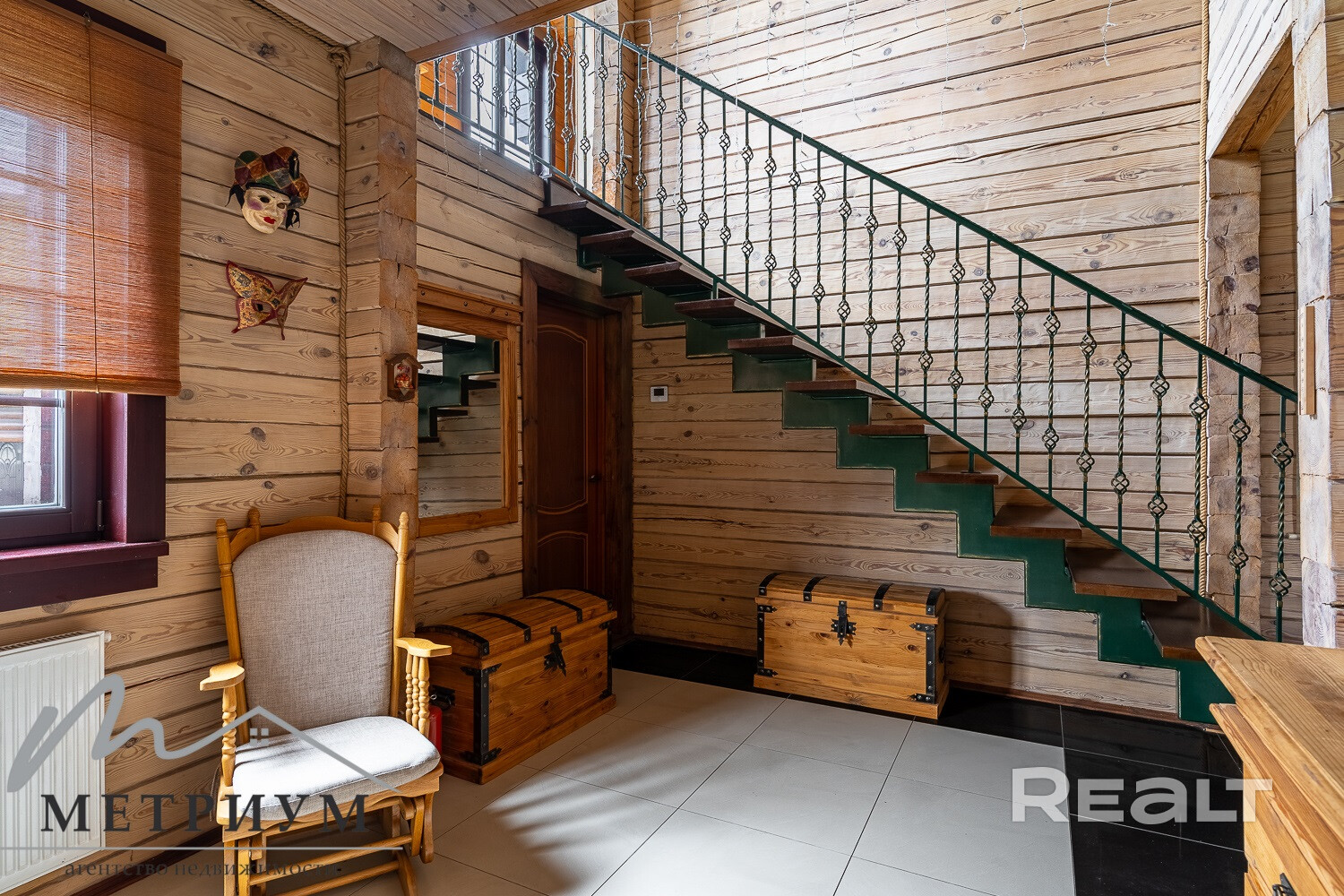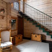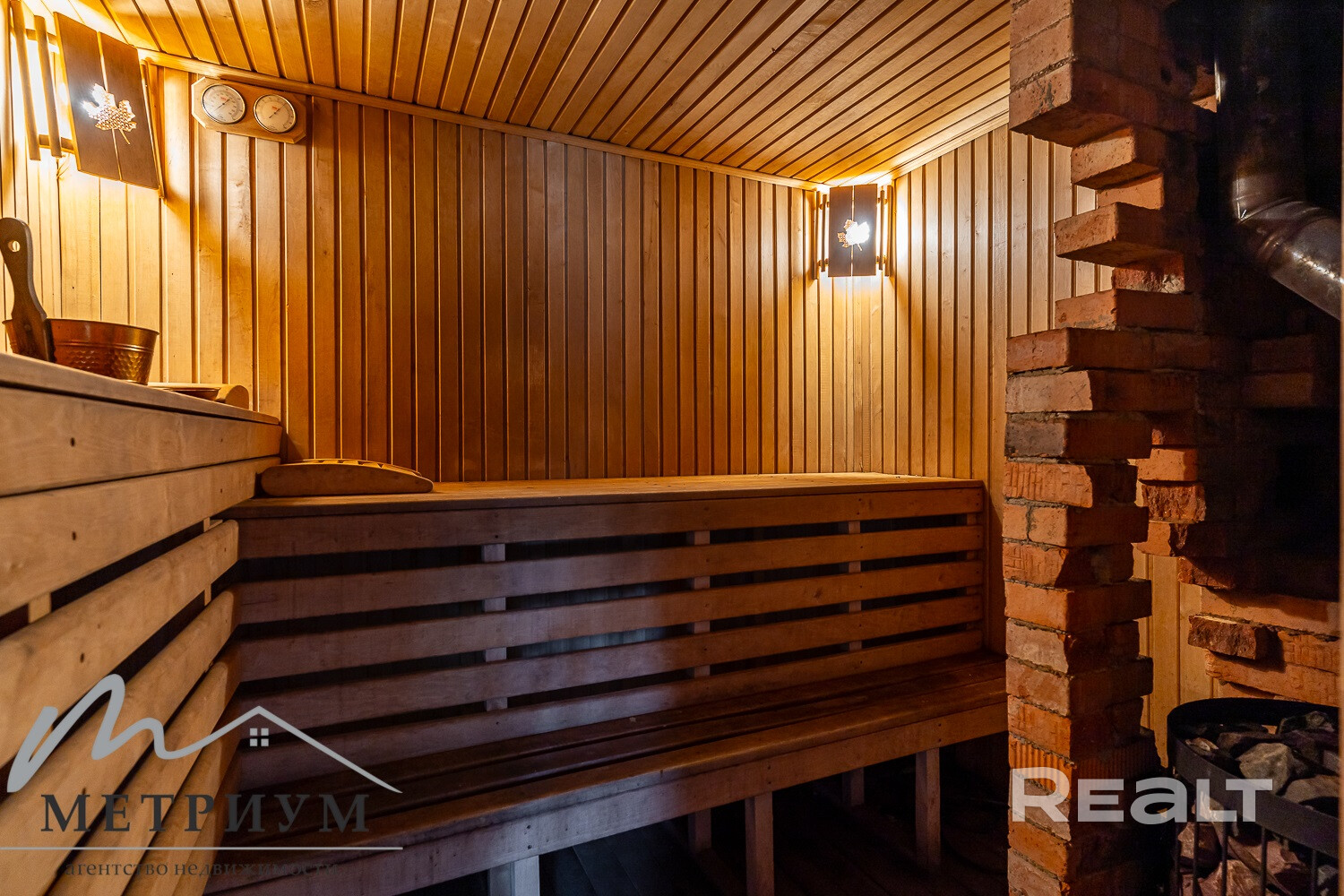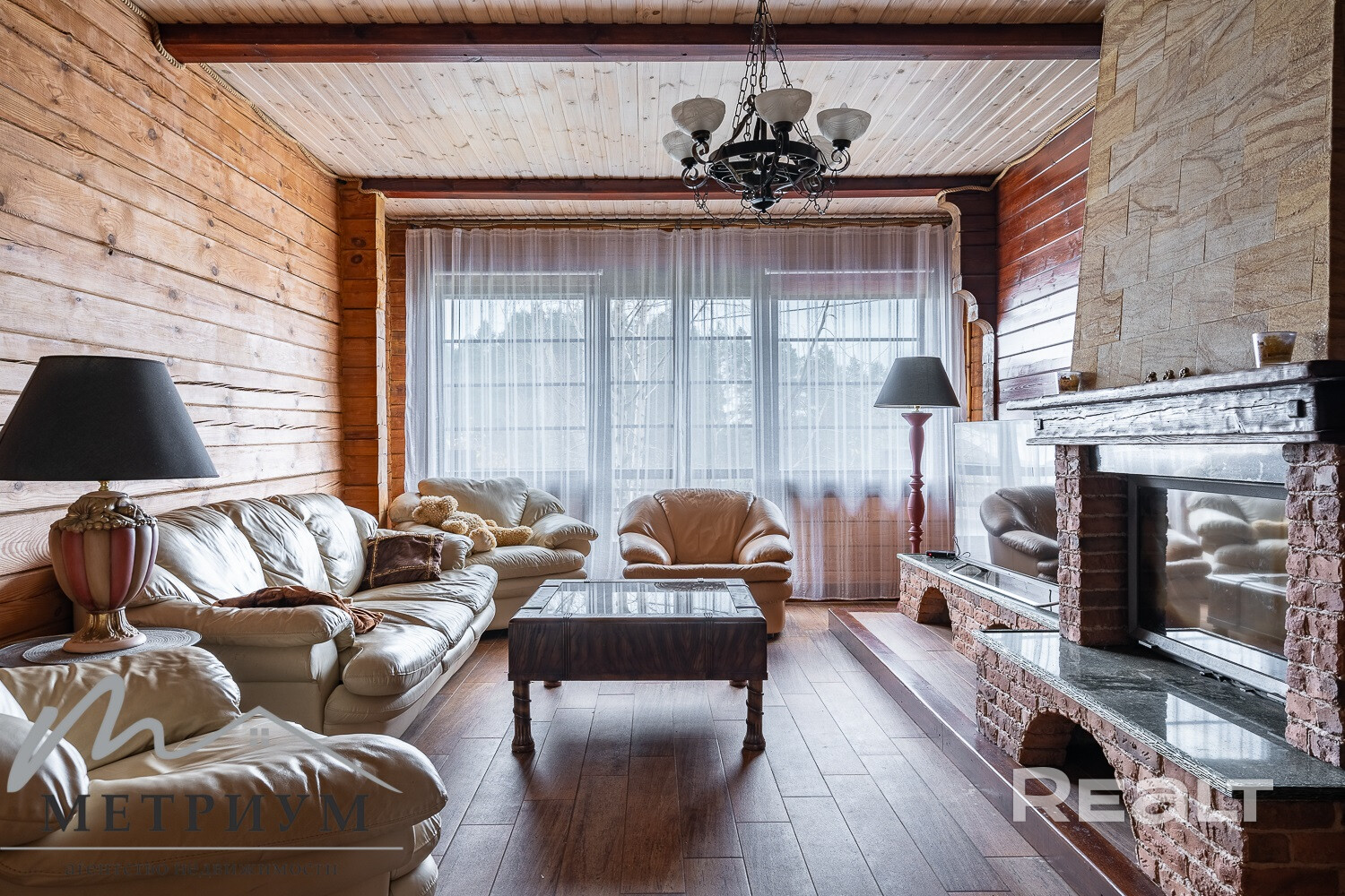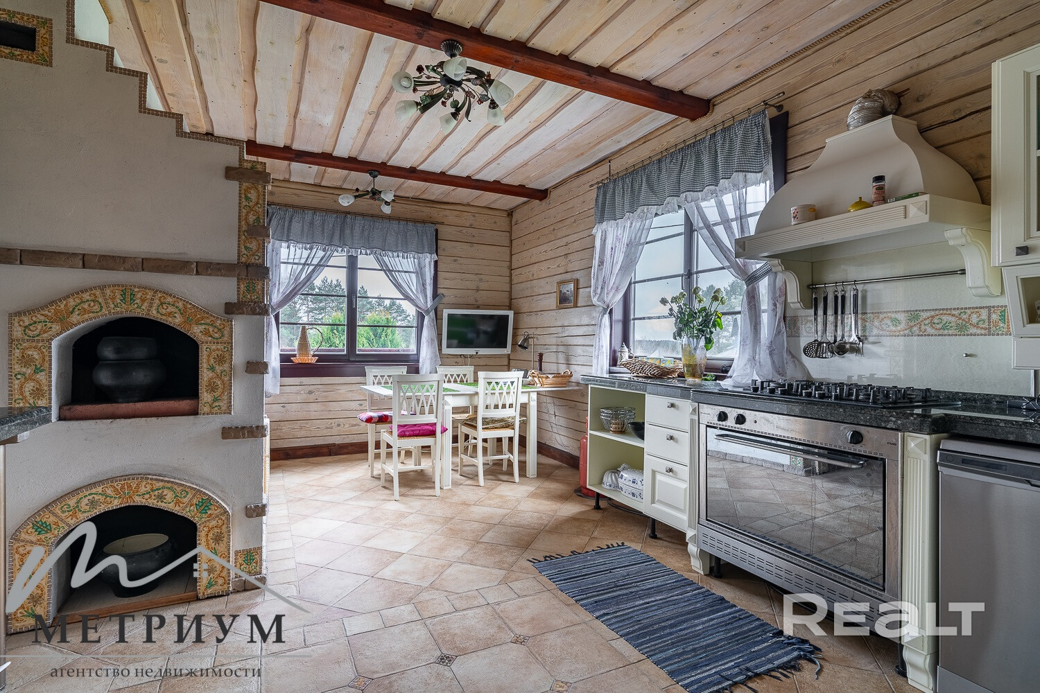 На 1-ом этаже расположена гостиная с камином на дровах и кухня-столовая с русской печью, жилая комната, топочная, 2 санузла. Из гостиной выход на просторную террасу.