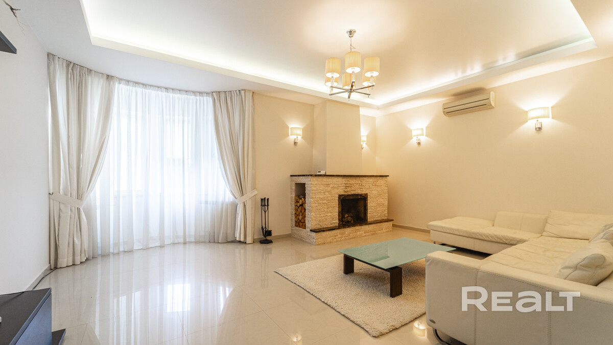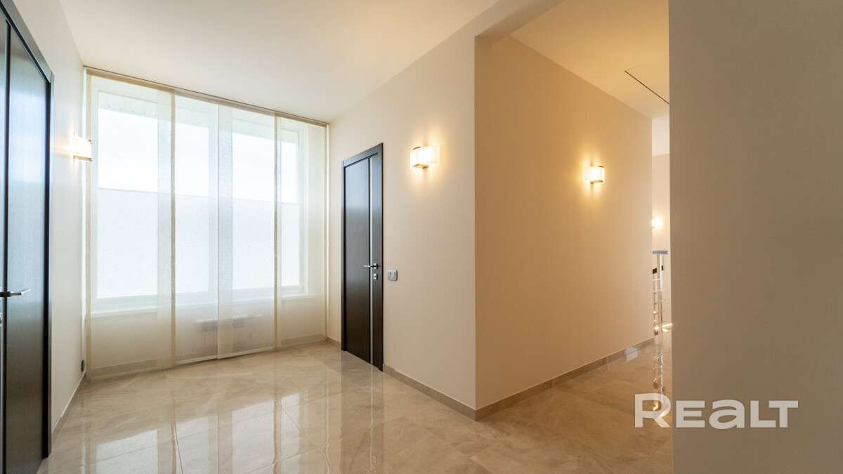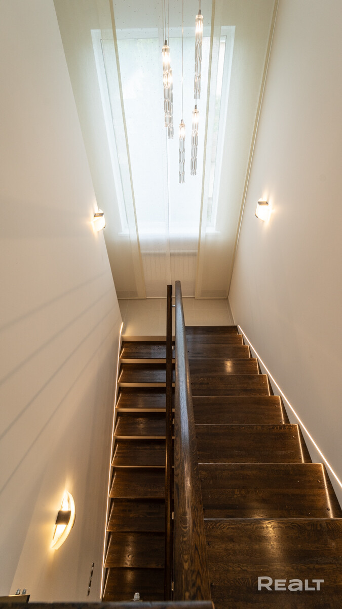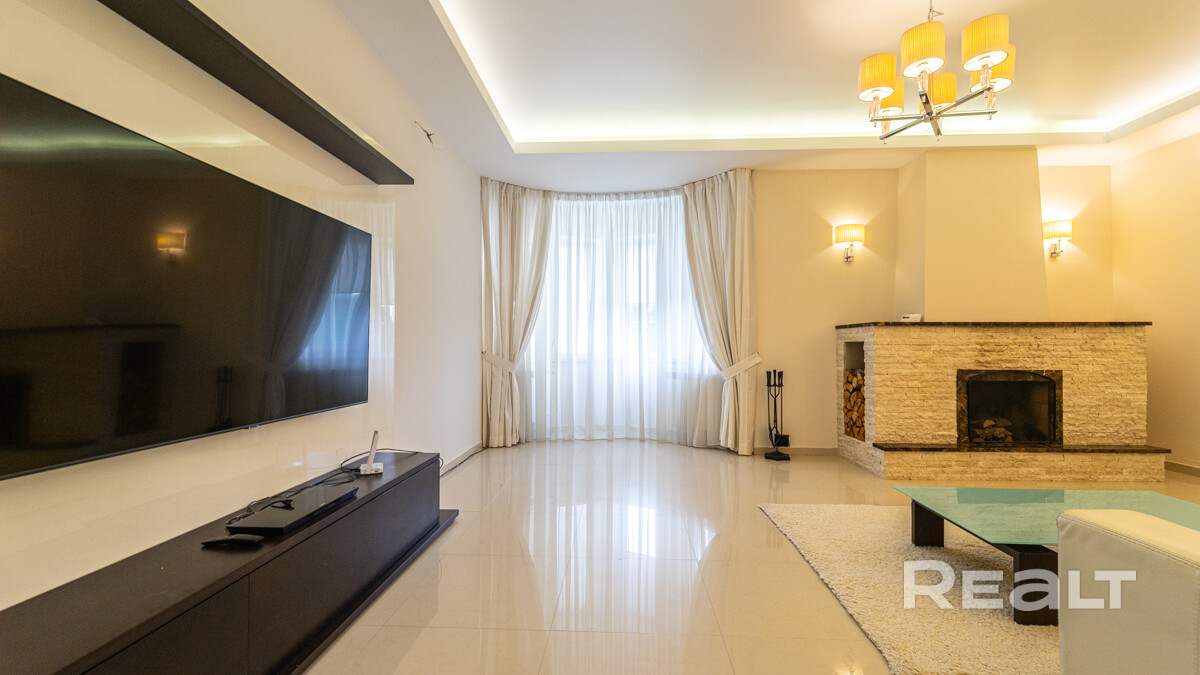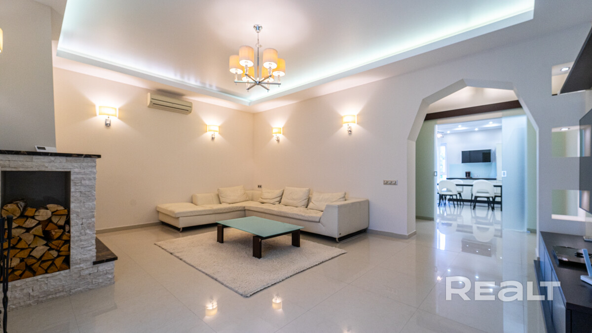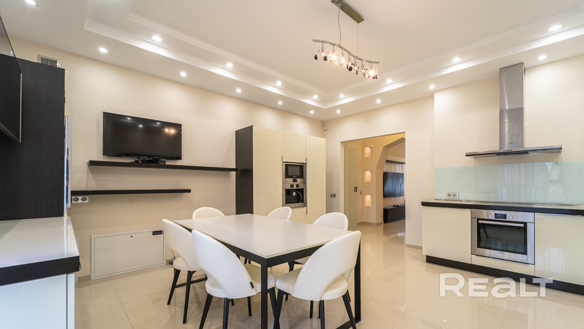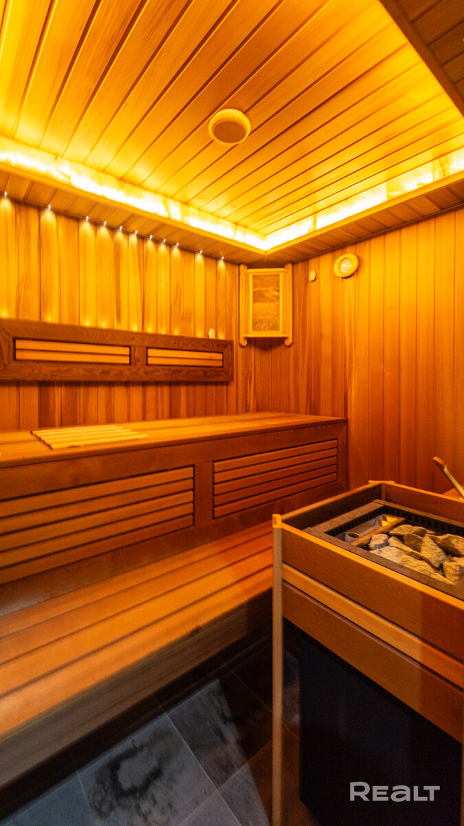 На первом этаже расположены кухня (24,6м2): кухонный гарнитур со встроенной техникой(духовой шкаф, индукционная плита, вытяжка, посудомоечная машина, свч печь и кофемашина, морозильник и холодильник) производства Германия- Liebherr, Bosch), просторная гостиная (26,8м2), оборудованная камином и кондиционером, полностью оборудованная сауна (сама парная3,8м2 +комната отдыха 9,3м2 +душ + туалет) санузел, топочная. Высота потолков на первом этаже-2,85