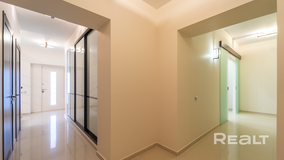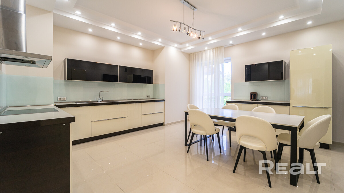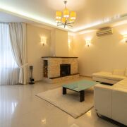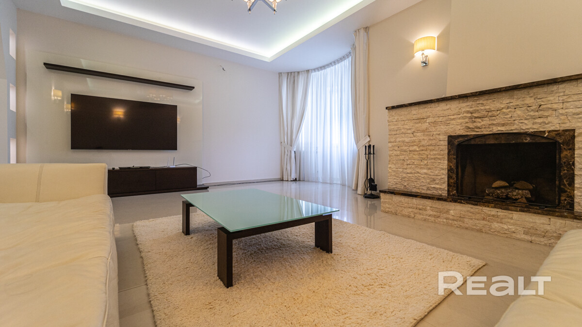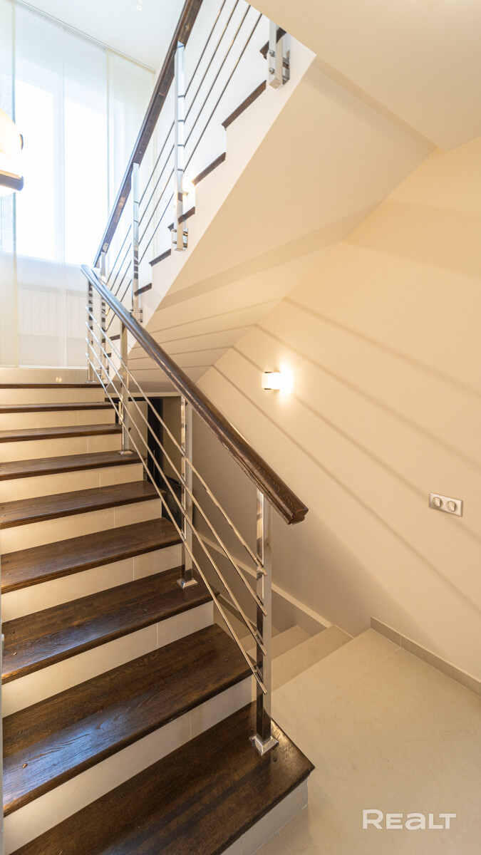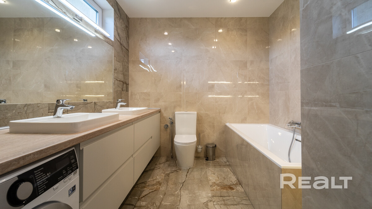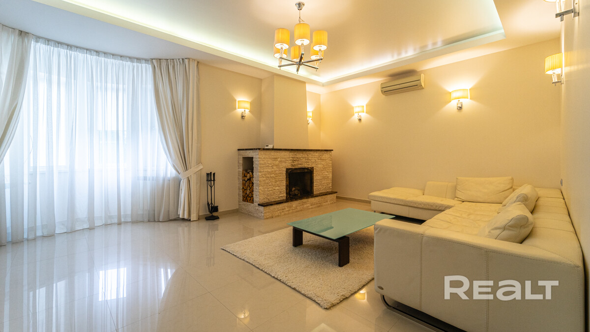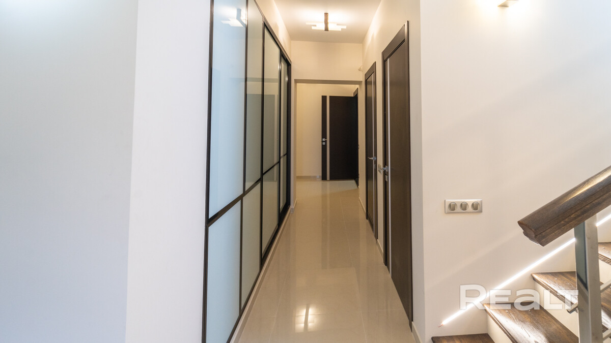 На первом этаже расположены кухня (24,6м2): кухонный гарнитур со встроенной техникой(духовой шкаф, индукционная плита, вытяжка, посудомоечная машина, свч печь и кофемашина, морозильник и холодильник) производства Германия- Liebherr, Bosch), просторная гостиная (26,8м2), оборудованная камином и кондиционером, полностью оборудованная сауна (сама парная3,8м2 +комната отдыха 9,3м2 +душ + туалет) санузел, топочная. Высота потолков на первом этаже-2,85