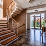 - Холл со вторым светом порадует вас прекрасным интерьером, наполненным качественной итальянской мебелью, светильниками и люстрами, стремящейся ввысь лестницей со встроенной подсветкой ступеней из дуба.