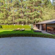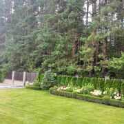 Расположен дом на участке с качественным газоном, обрамлённым прекрасными декоративными деревьями и кустарниками выполнено качественное мощение дорожек и площадок.