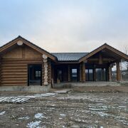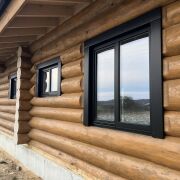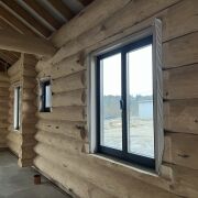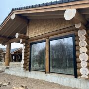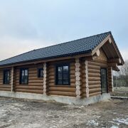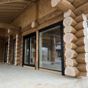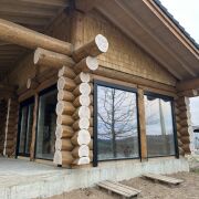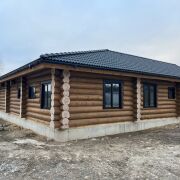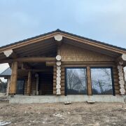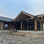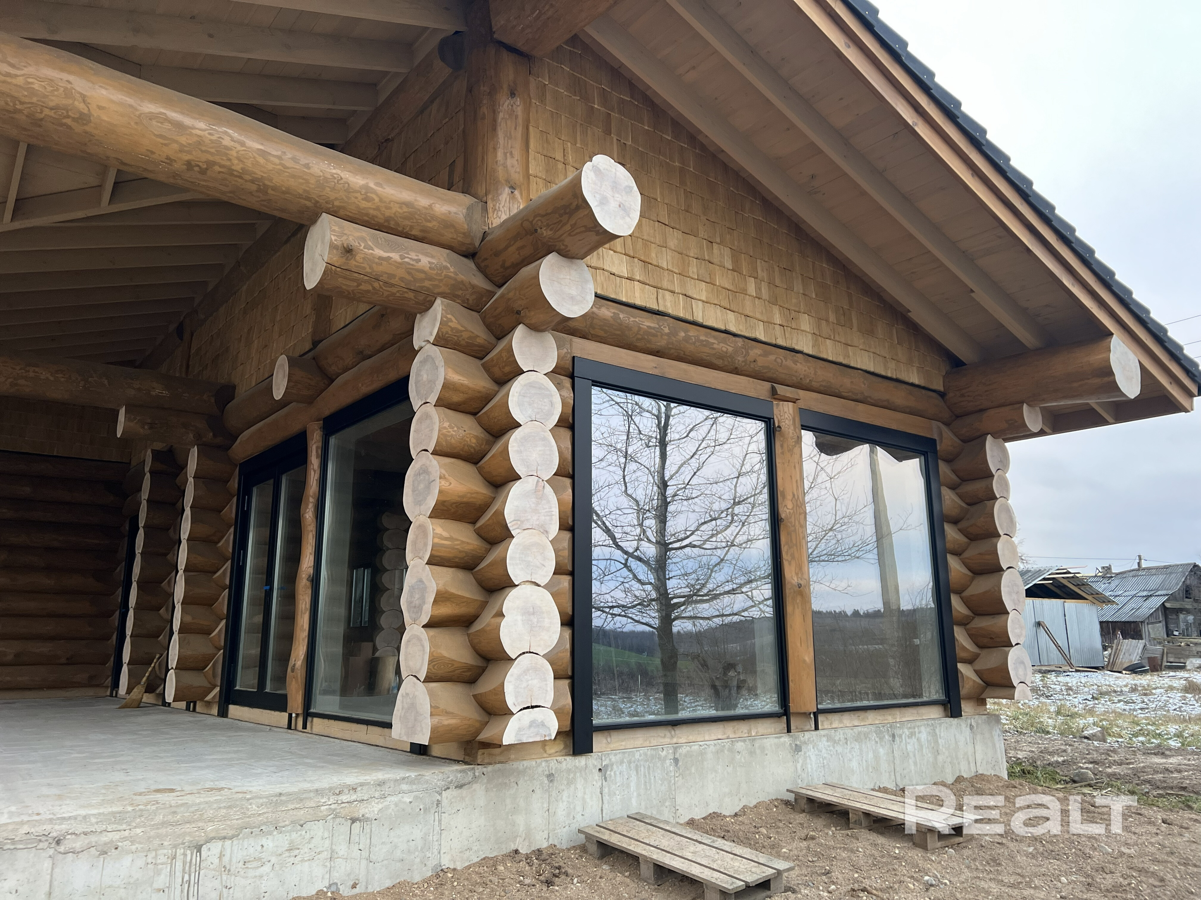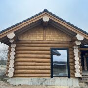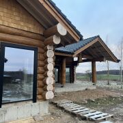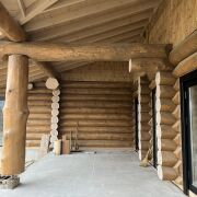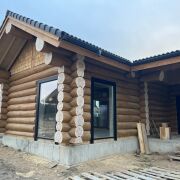 Дом из круглого бревна в канадский угол с завешиванием и элементами Post & Beam ) диаметры от 36 до 50см ручной заготовки по проекту как на рендерах ,высота потолков от 3 до 5м (в проекте предусмотрен второй свет) ,бревно внутри дома чистое под отделку .Фасад снаружи дома отшлифован в 3 прохода и рокрашеным немецким ммаслом Biofa в индивидуальный цвет ,фасад комбинированный ,элементы Post & Beam отделаны дубовым шинделем .Кровля цементно-песчаная цвета черного 9005 с отрытой стропильной системой и отделкой строганной доской.