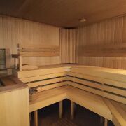 Парная обшита лиственницей, которая обладает высокой влагостойкостью, устойчивостью к гниению и хорошо сохраняет тепло, она выделяет полезные фитонциды.