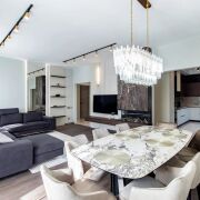 Новый шикарный коттедж возле леса из красного кирпича с использованием дорогих итальянских материалов. На первом этаже большая гардеробная, просторная спальная комната, великолепный зал с камином, отдельный санузел и достаточных размеров кухня. Второй этаж представляет собой четыре спальни: паркетная доска импортная, раковины и ванные Villeroy & Boch, унитазы Смарт. Техника на кухне Smeg (Италия). На третьем этаже - просторная игровая комната с бильярдом и двумя отдельными спальнями. В цокольном этаже - дополнительные комнаты, просторный холл с мини-кухней, ванной, душем и парилкой. Из гаража есть вход в дом на первый этаж.