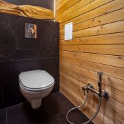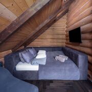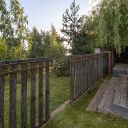 Гостевой дом ( 127,4 м2) включает в себя просторную гостиную с камином, кухню, сауну и душевую комнату. Имеется помещение для хранения хозяйственного инвентаря, дровница, мастерская. А также зона барбекю.