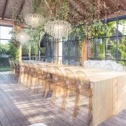 Интерьер гостиной впечатляет: панорамные окна, камин, большой стол для праздничных событий, диваны и необычный растительный декор.