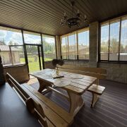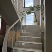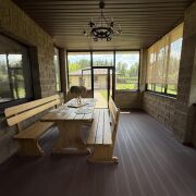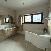 На первом этаже терраса, большая кухня 22,4 кв.м, гостиная 34.7 кв.м., топочная,санузел. Второй этаж состоит из трех изолированных комнат, родительская спальня 22,2 кв.м и две детских по 16 кв.м., а также большой санузел 8.5 кв.м. с окном.