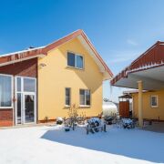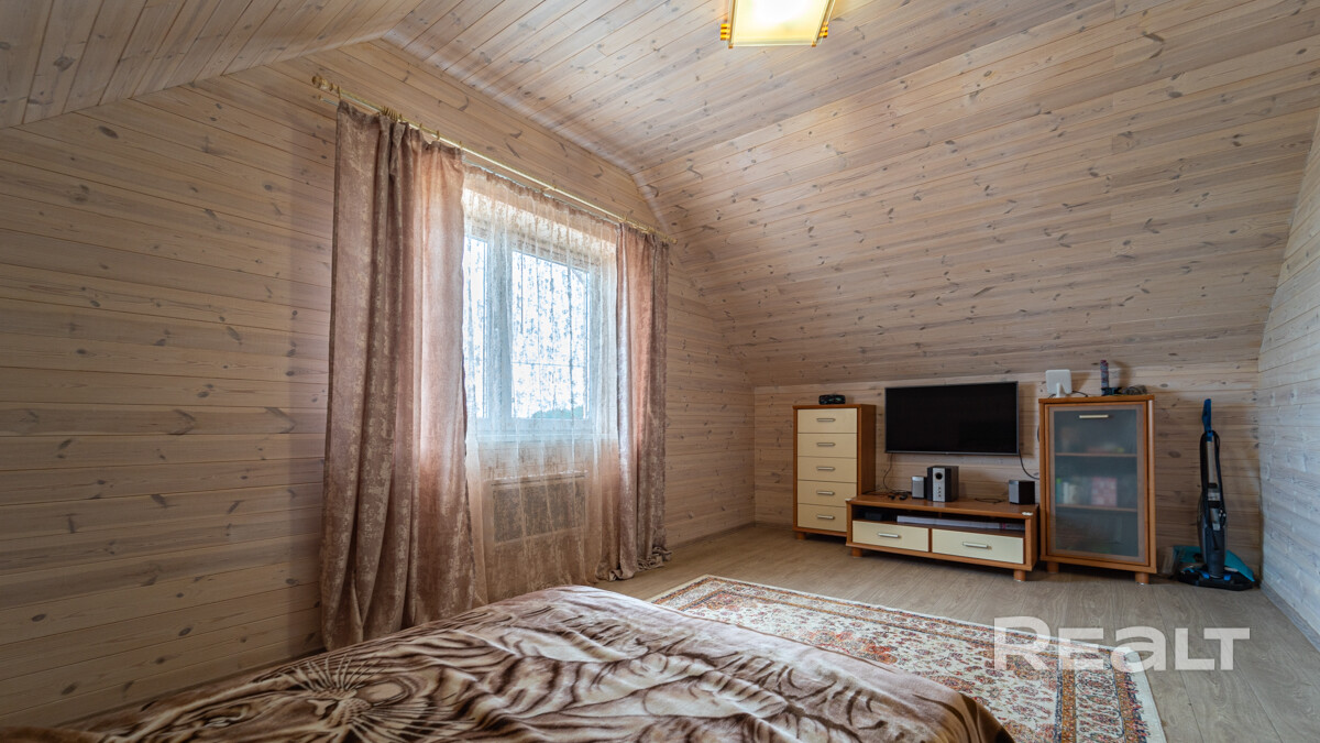На первом уровне расположены: огромная веранда, кухня-гостиная, жилая комната, санузел с сауной. Удобная лестница на второй уровень, где расположены две жилые комнаты. Окна в доме расположены на обе стороны.