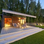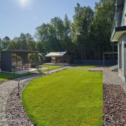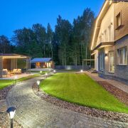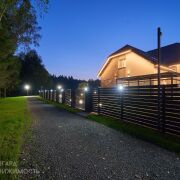 Большой облагороженный земельный участок площадью 17.5 соток с газоном и ландшафтным дизайном в частной собственности. На участке расположены дом с навесом-террасой, беседка, навес на два авто с хозблоком, баня и вольер. Участок огорожен забором, по периметру множество декоративных растений и насаждений, организовано повсеместное освещение, въездные откатные ворота открываются с пульта. Калитка с видеодомофоном. Участок угловой, граничит с лесом, тупиковый заезд, полное отсутствие транспортного трафика на прилегающей облагороженной территории(на въезде установлен шлагбаум, размещены современные фонарные столбы с датчиками движения, асфальт до участка).