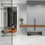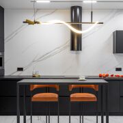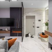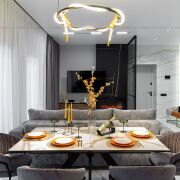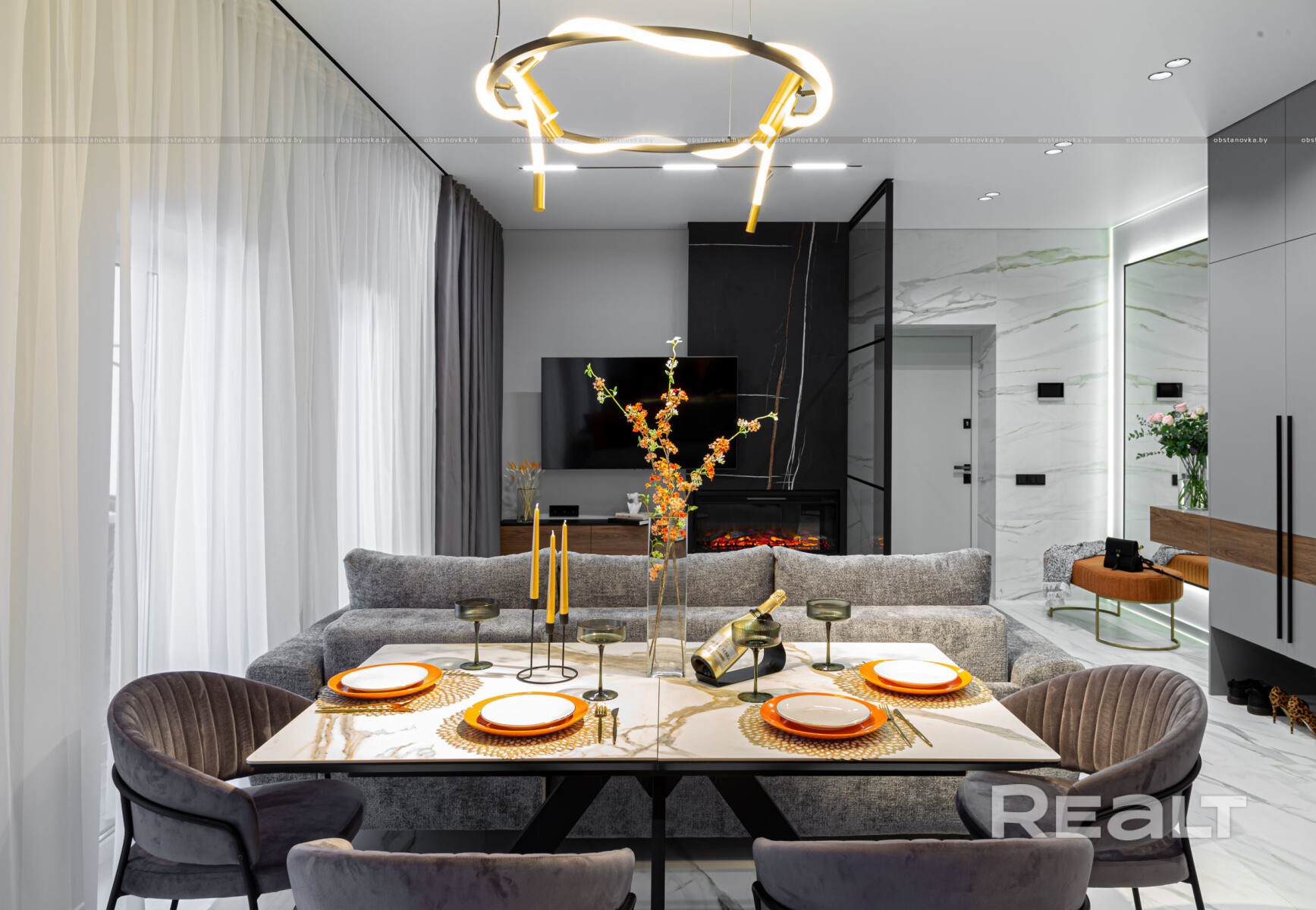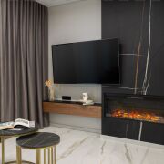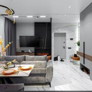 Изюминкой этого объекта стала кухня-гостиная: с вместительной входной группой, черной угловой кухней, оснащенной всей техникой, полноценной обеденной зоной и шикарной тв зоной с камином.