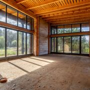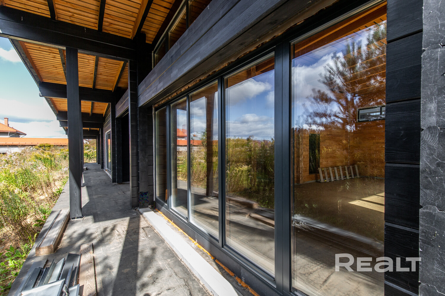 Готовность дома 50%. При строительстве заливался монолитный фундамент, стены изготовлены по финской технологии из клееного бруса, фальцевая кровля.