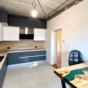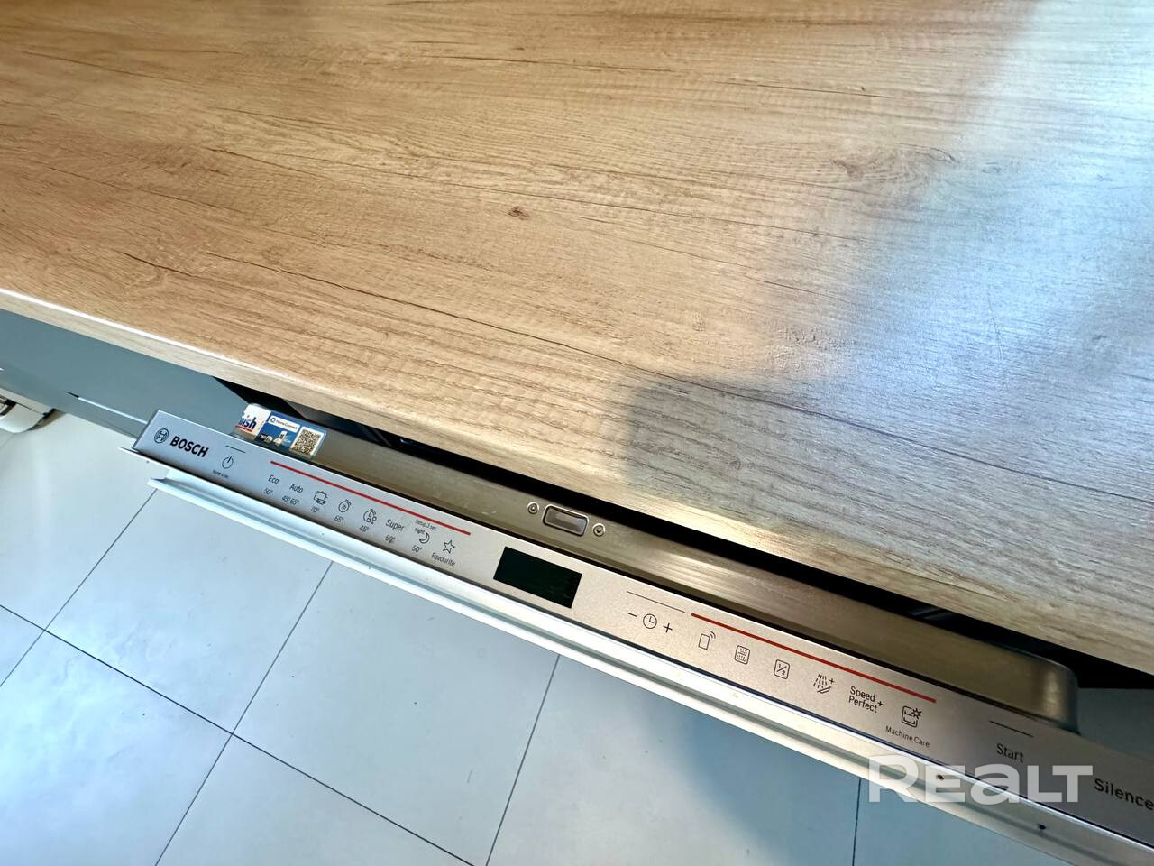 Современная кухня со встроенной мебелью и техникой: посудомоечная машина BOSCH, электрическая варочная панель, вытяжка BOSCH, микроволновая печь, 2-х дверный холодильник, телевизор SAMSUNG, корпус кухни ЛДСП EGGER, кухонные фасады - акрил Niemann, столешница - постформинг EGGER, фурнитура – BLUM, дизайнерский обеденный стол.