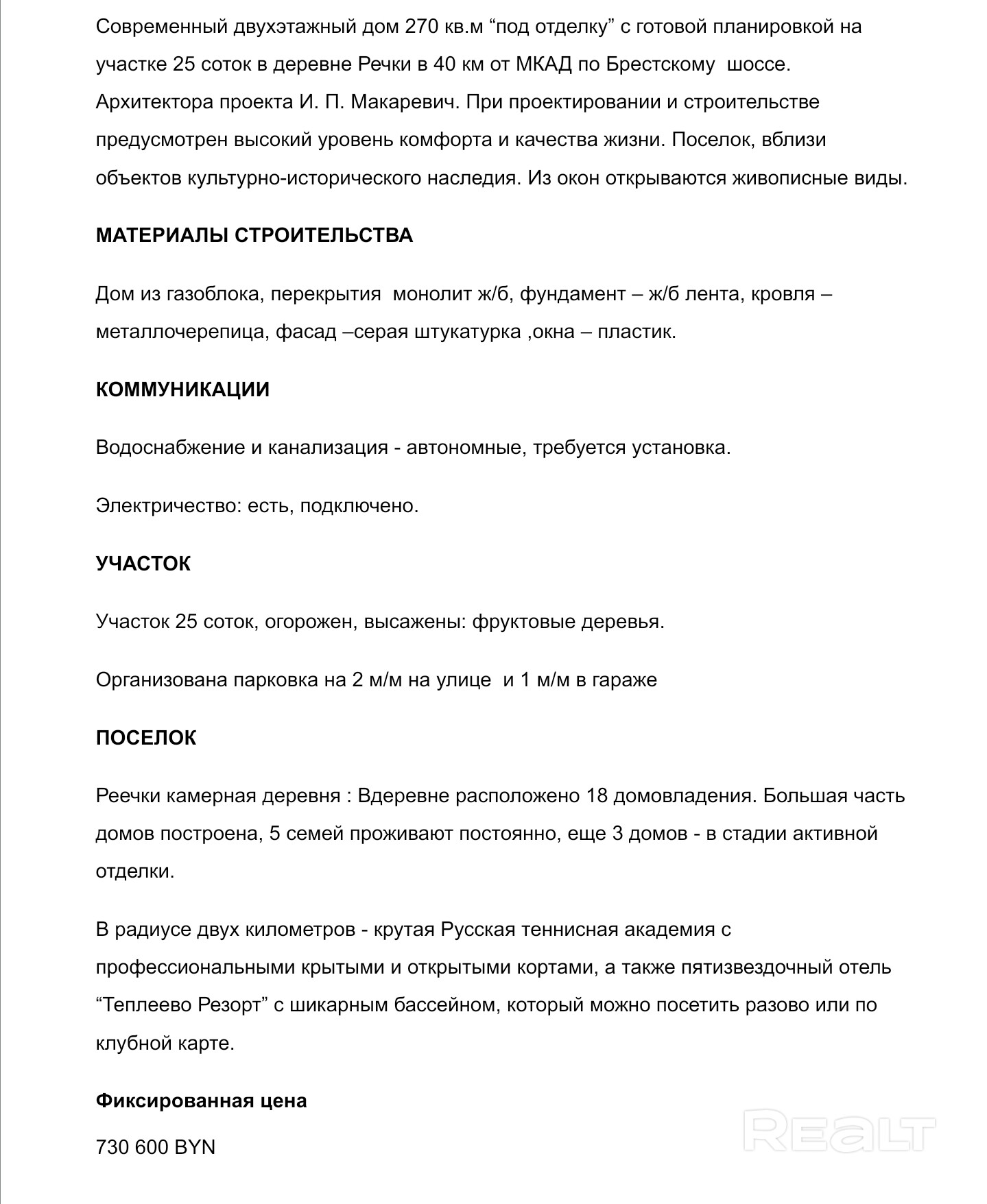 Современный двухэтажный дом 270 кв.м «под отделку» с готовой планировкой на участке 25 соток в деревне Речки в 40 км от МКАД по Брестскому шоссе. Архитектор проекта — И. П. Макаревич. Проект реализован с применением качественных материалов и продуман для комфортной жизни. Пишите в личные сообщения и я пришлю видео обзор дома