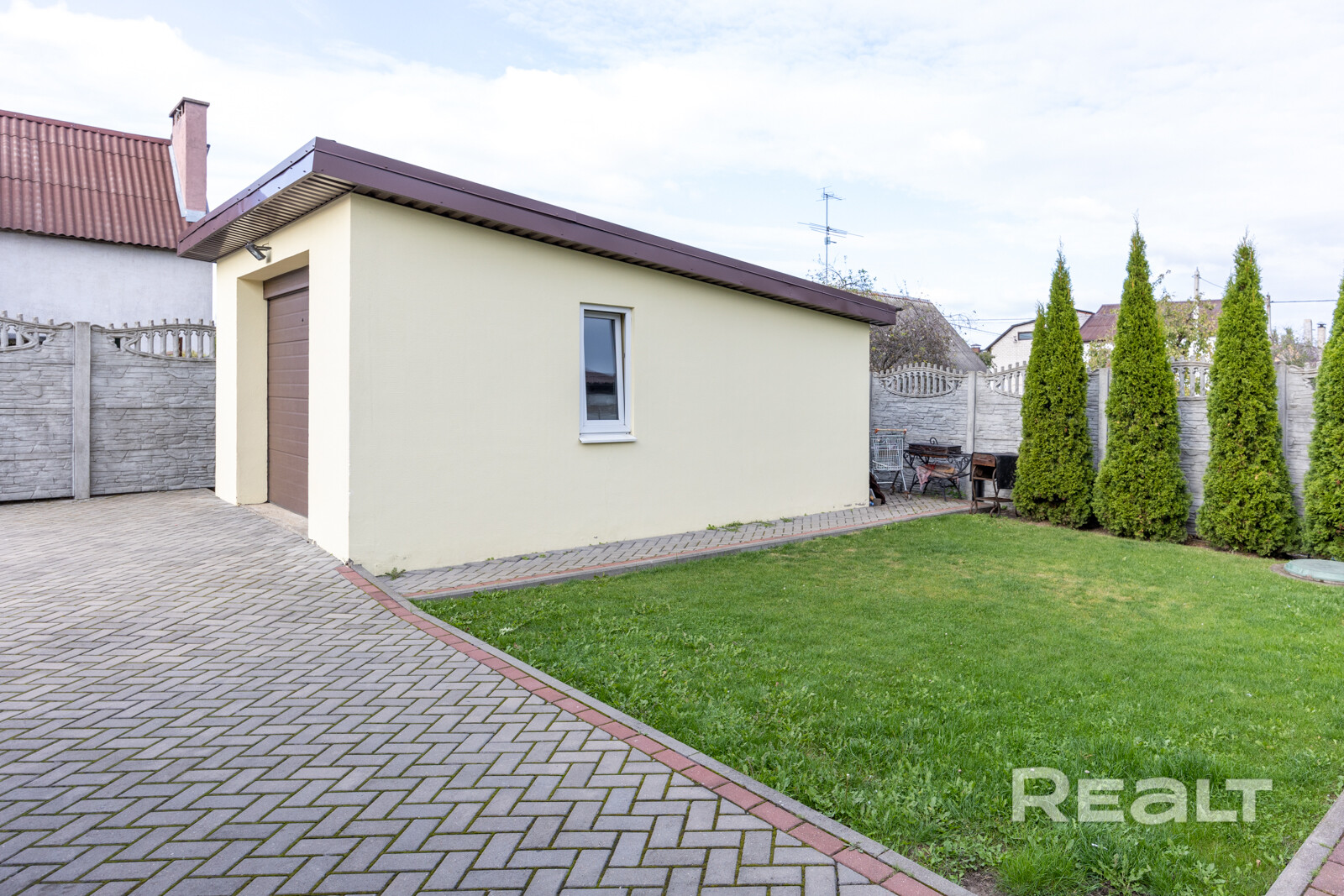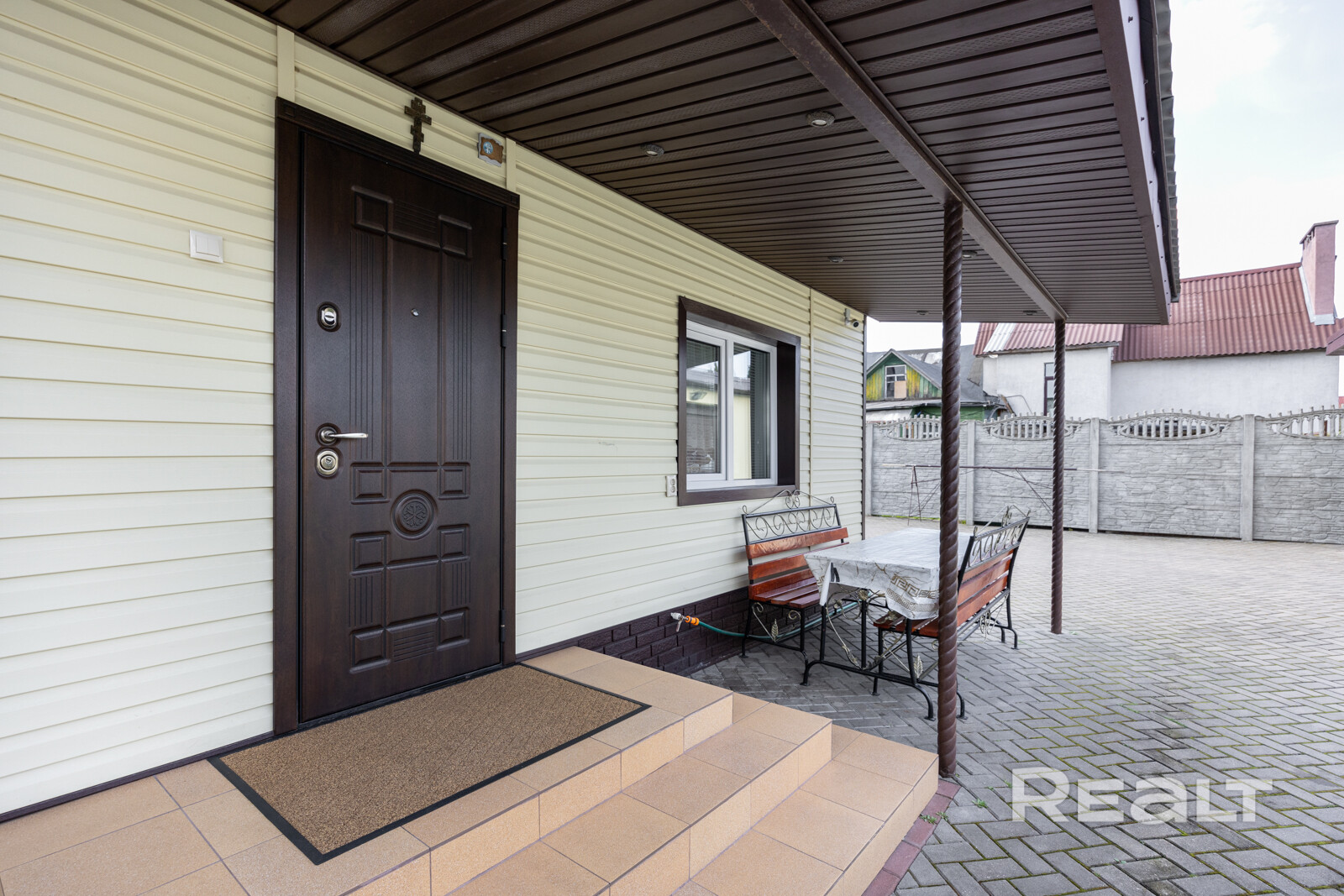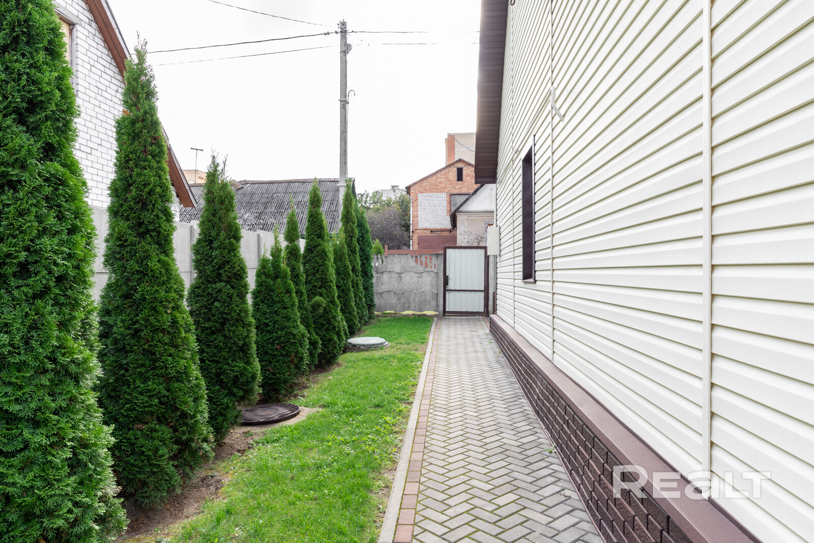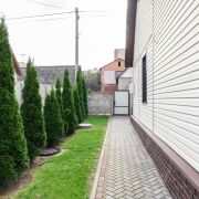 Двор прекрасно облагорожен, есть газон, дорожки выложены плиткой, у входа в дом навес с зоной барбекю.