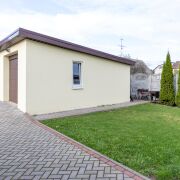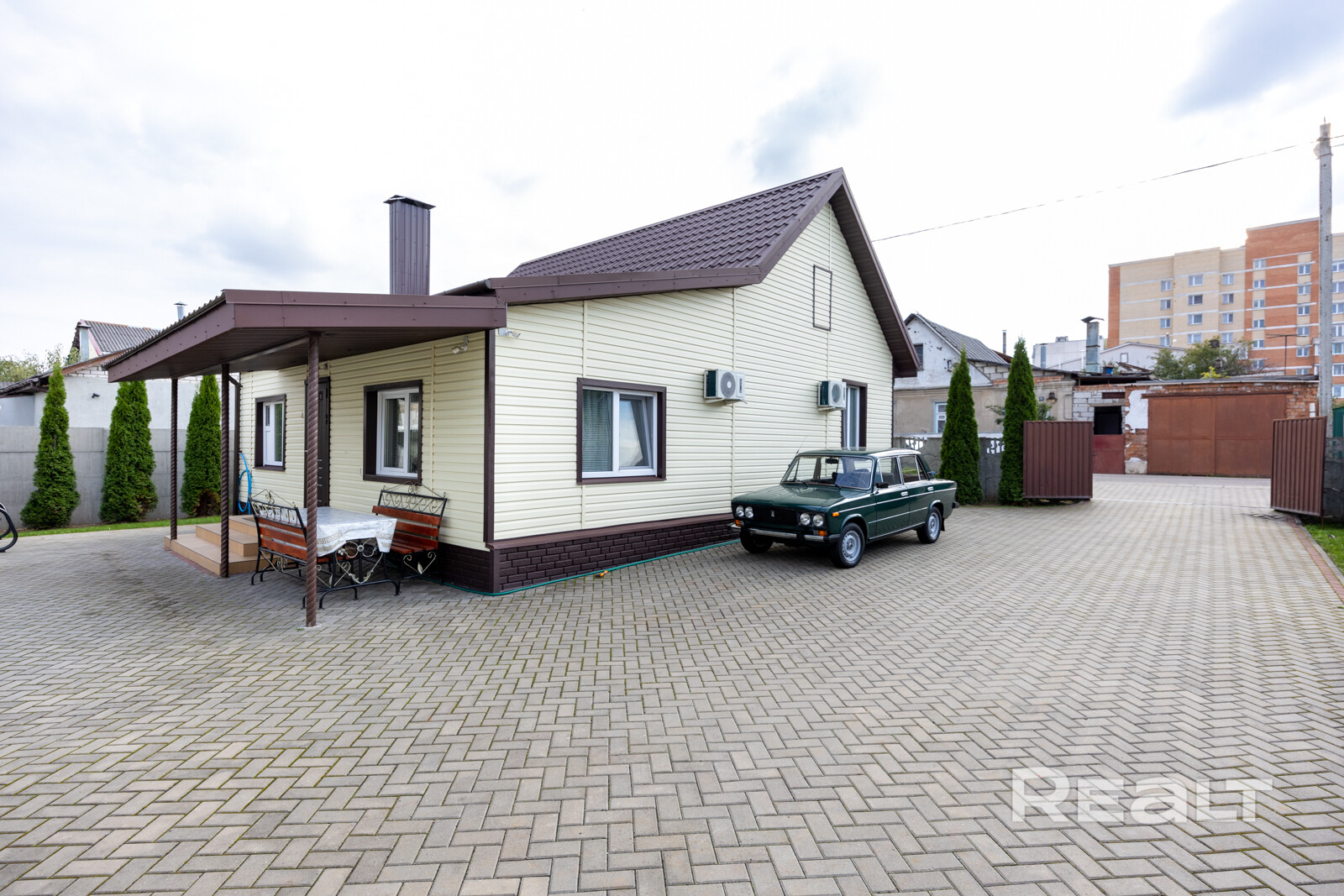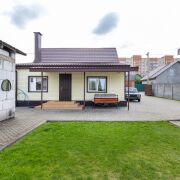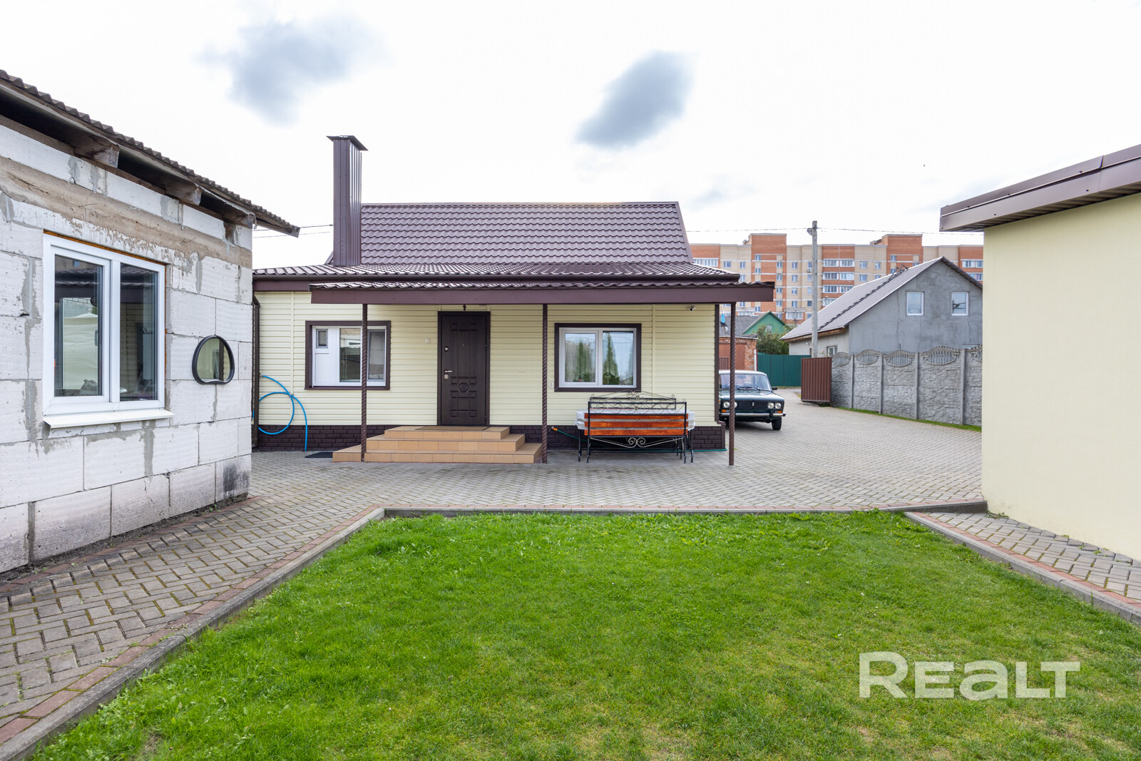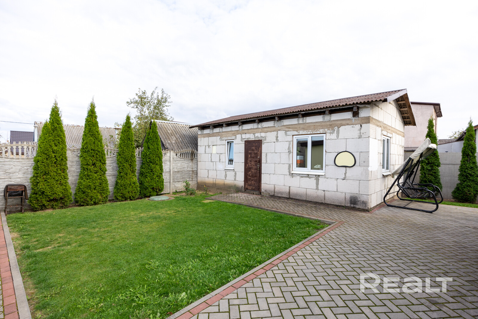 Двор прекрасно облагорожен, есть газон, дорожки выложены плиткой, у входа в дом навес с зоной барбекю.