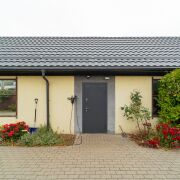 На участке выполнен ландшафный дизайн - туи, декоративные кусты, деревья, цветы. Есть зарядка для электромобиля.