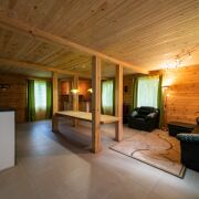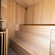 Просторная финская сауна с кухней, баром и большой комнатой отдыха с камином
