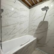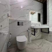 Хозяйский санузел оборудован отдельной ванной, безбарьерной душевой зоной с лейкой тропического ливня, унитазом с инсталляцией и псевдо биде, умывальником.