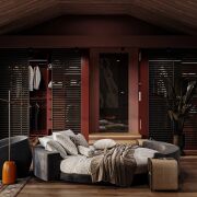 · Высота потолка в коньке — 4,8 метра, отделка термодеревом класса «Экстра».
