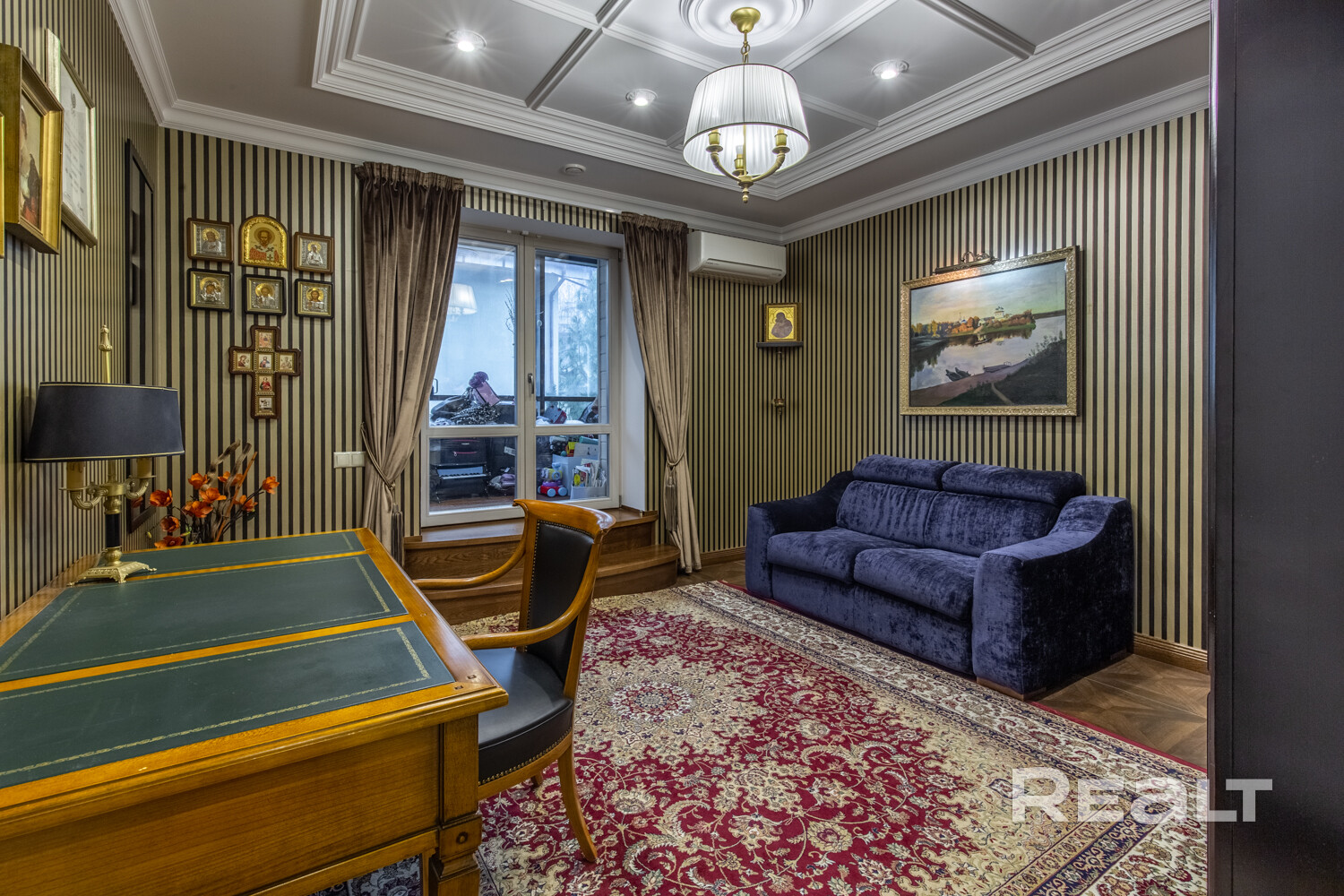 Квартира оборудована уборочной системой (встроенной и разведённой по всем этажам). Коммуникации центральные . Полы- паркет и плитка. Электрическая сауна, купель.