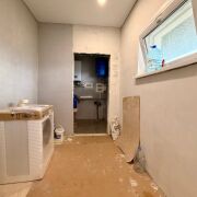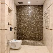 · Просторный санузел, отделанный плиткой, с изысканной мозаикой в душевой и современной инсталляцией.