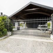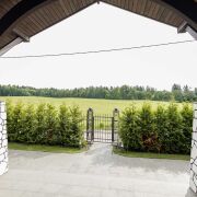 ворота, крытая парковка для авто, гараж. Терраса, крыльцо, дорожки выложены гранитом. Красочная детская площадка.