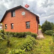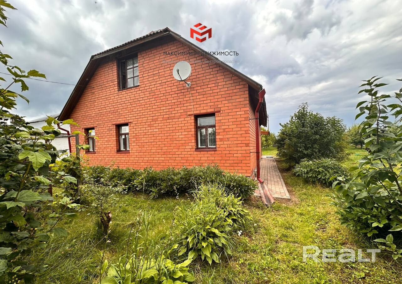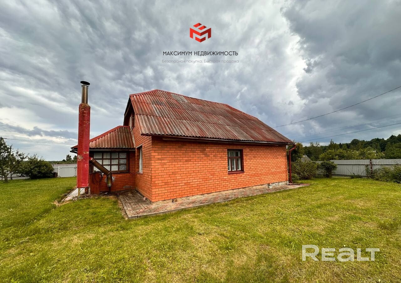 Дом с мансардой, построен из бревна и облицован красным кирпичом.