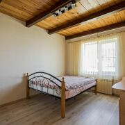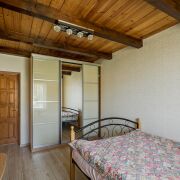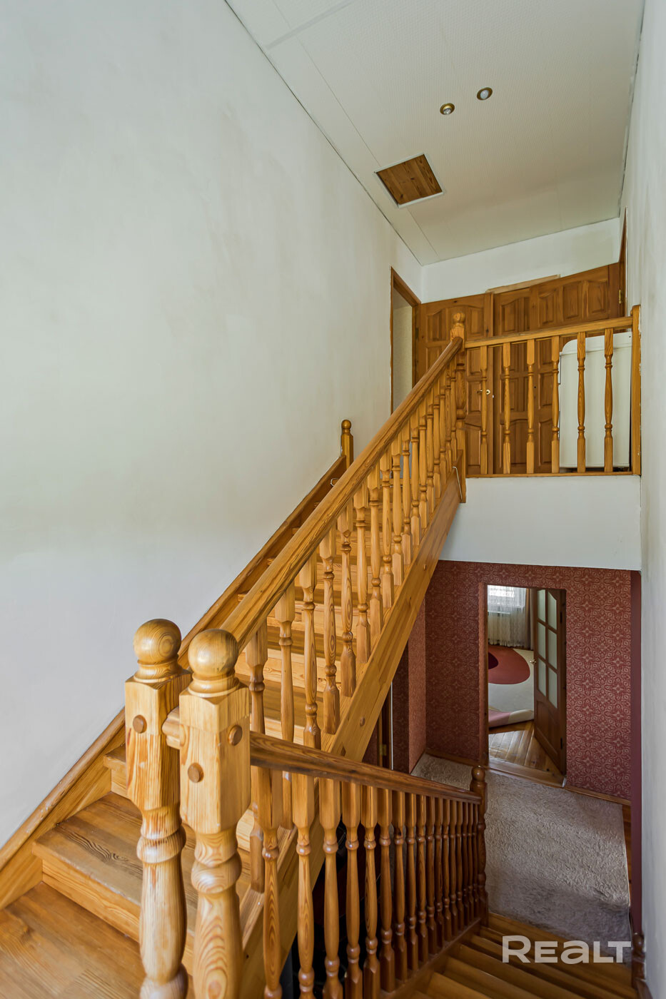 Первый этаж – прихожая 13.2 м, кухня-столовая, две просторные жилые комнаты (22.5 м и 18.9 м), раздельный сан.узел. На второй этаж ведет деревянная лестница с удобным маршем. Две спальни по 14.8 м, и полностью остекленная лоджия, где для любителей флоры можно организовать зимний сад. Смотрите фото;