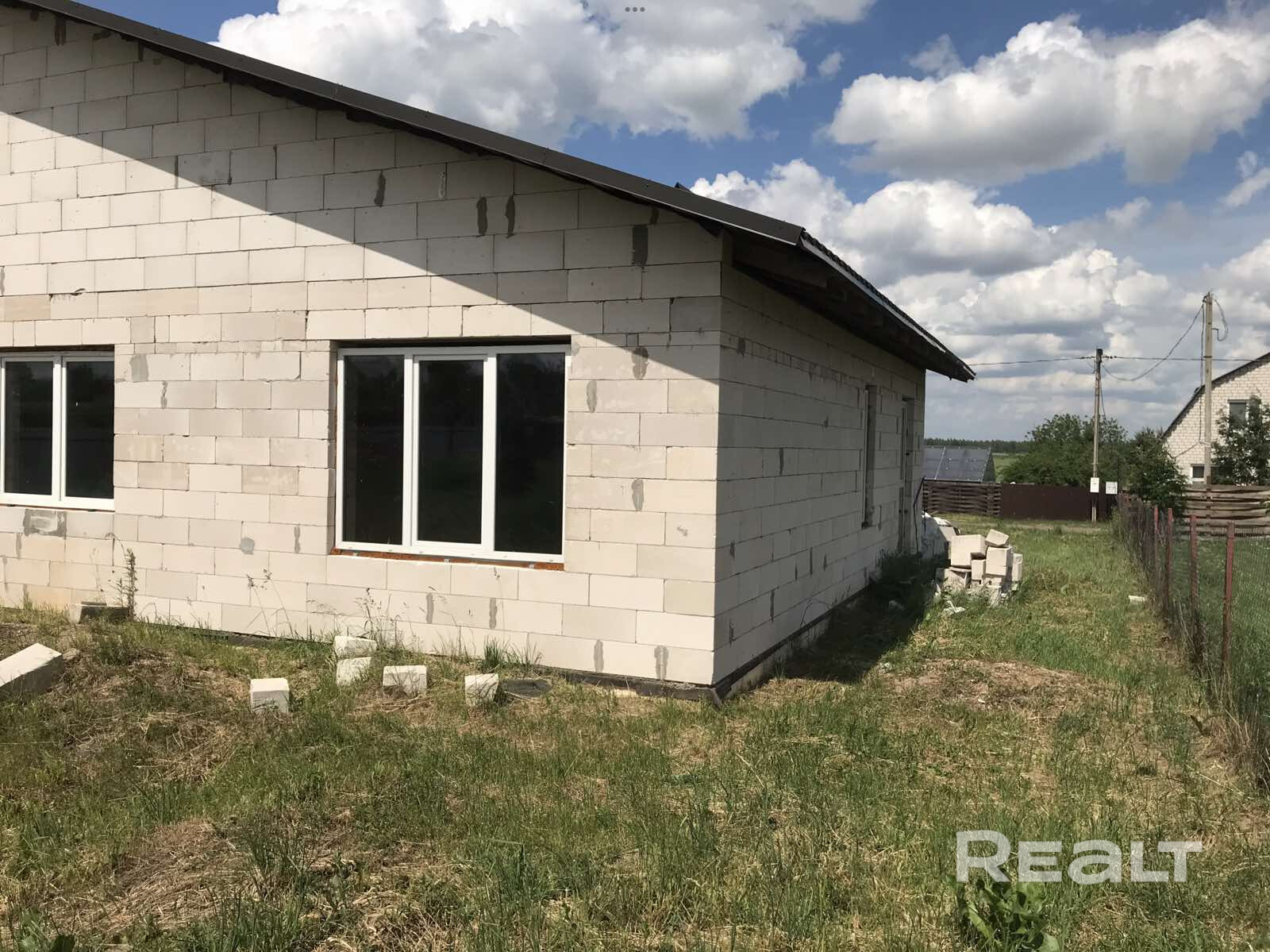 Незавершённое законсервированное капитальное строение в 25 км от Минска, на участке 15 соток. Размеры дома 15,7х11,7 м, общая площадь 180 кв м. По проекту в доме 3 спальни, гостиная, кухня, гардеробная, тамбур, котельная, 2 санузла, терраса.