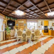 Просторная кухня-столовая с «теплым» полом 29м2, полностью оборудованная всем необходимым (встроенная посудомоечная машина BOSH, электрический духовой шкаф, варочная панель (две конфорки газовые, две индукционные), продуктивная система вытяжки, большой раскладываемый стол 12 мест).
